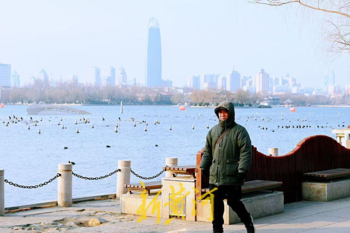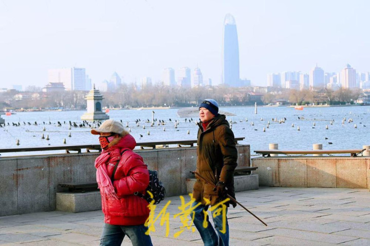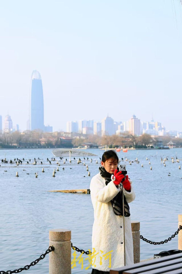 1月17日,泉城迎来寒潮天气,气温虽低但也抵挡不住游客游览大明湖的热情,寒风中的大明湖波光粼粼,行走在明湖北岸,游人与远处的高楼建筑相映成趣,展现出独特的冬日韵味。