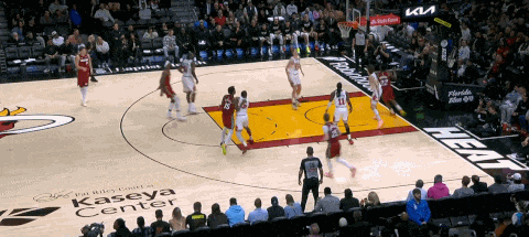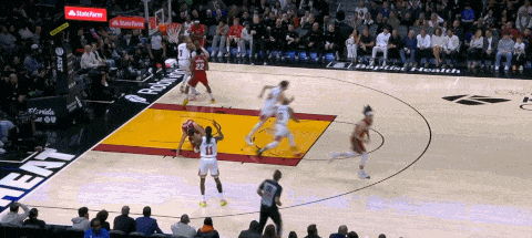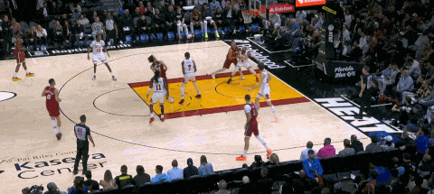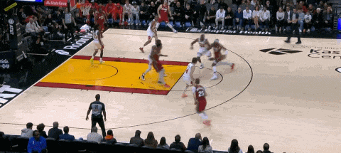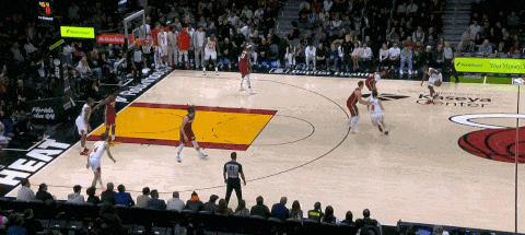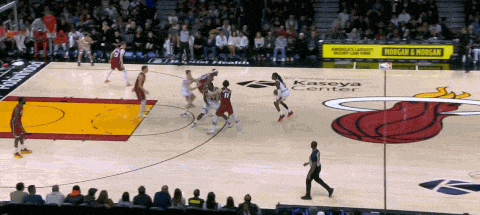 弧顶的double drag双掩护,多森姆利用奥科罗和帕威的掩护向右移动,帕威顺下的威胁吸引了左侧热火防守的刷卡协防,奥科罗短暂获得出手机会,多森姆送出传球助攻奥科罗命中三分。